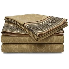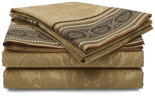 croscill's "Onyx" sheet set is the perfect way to complete your Onyx bedding ensemble. The Onyx sheets have a 5 inch engineered paisley stripe print band in black and gold that runs along the top of both the flat sheet and the pillow cases, while the body of the sheets are a damask print in a soft gold tone. The flat sheet has a 1/2 inch hem on all sides, there are no raw edges. The fitted sheet has elastic around all sides for a secure fit and a 16 inch pocket to accommodate mattresses up to 18 inches thick. The Onyx sheet set is 100% cotton, 300 thread count and includes one king flat sheet, one king fitted sheet, and 2 king pillow cases.